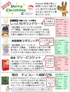 「また間食してしまった・・・」なんて罪悪感を少しでも軽減でき、かつ血糖値が低めの時の補食の参考になるようなお菓子をXmasプレゼントとしてお渡ししつつのご紹介です。